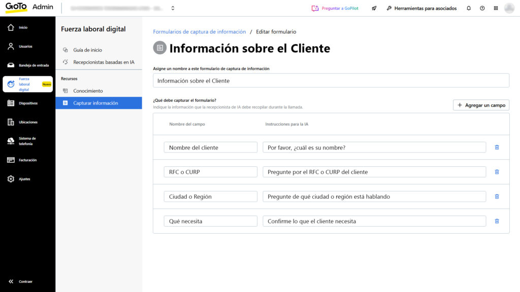 Es posible configurar un formulario que el interlocutor complete (por ejemplo, nombre, correo electrónico, motivo de la llamada) antes de ser transferido a un agente humano, lo que permite la calificación o recopilación de datos útiles.