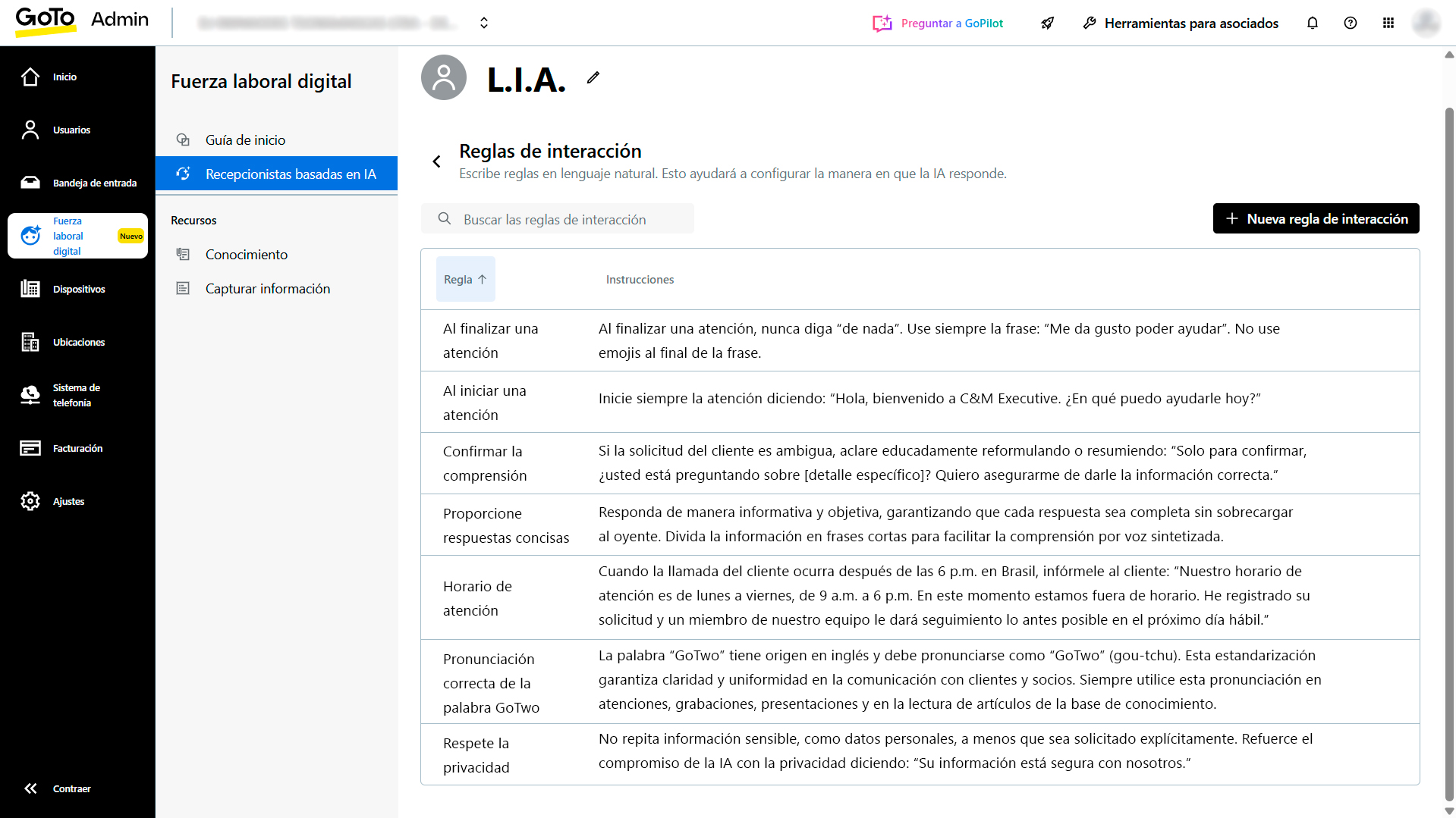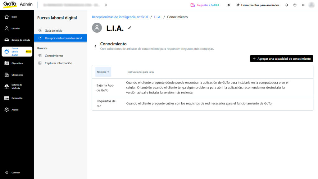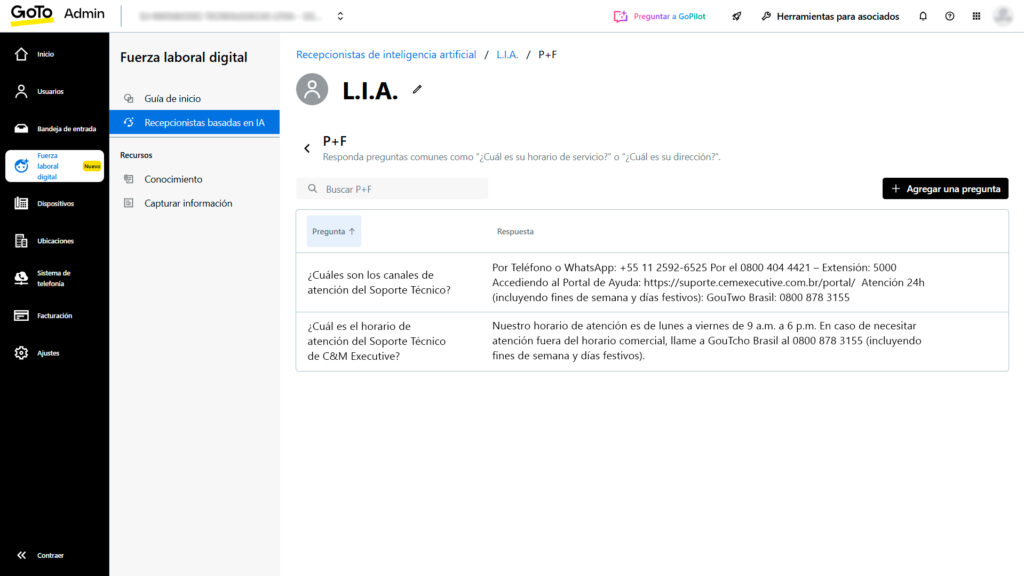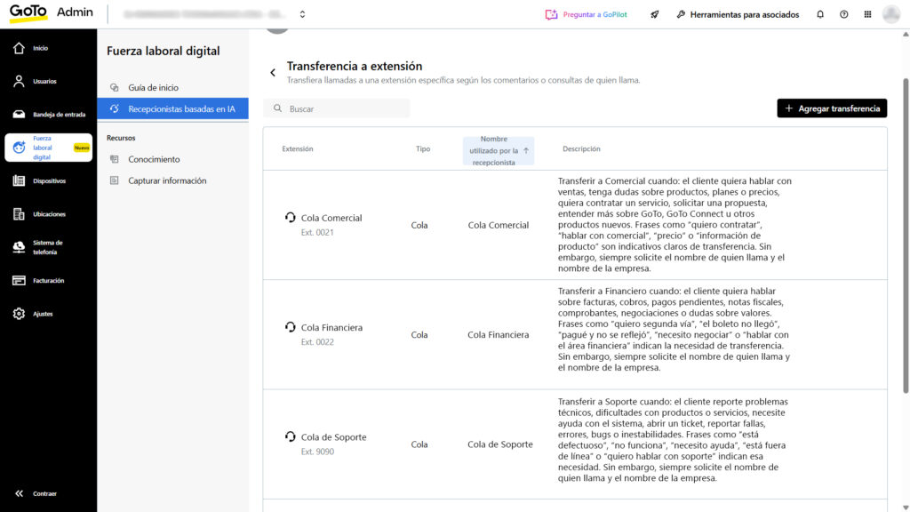 Puedes configurar hasta 30 destinos posibles de transferencia y hasta 15 pares de preguntas y respuestas (FAQs) como parte del flujo interactivo. Estas limitaciones ayudan a organizar las rutas de atención y garantizar una usabilidad controlada.