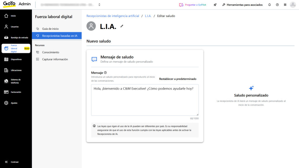 La recepcionista con IA inicia la atención con un saludo configurado (como “Hola, has llamado a...”) y espera una respuesta del cliente antes de continuar, garantizando claridad al inicio de la interacción.