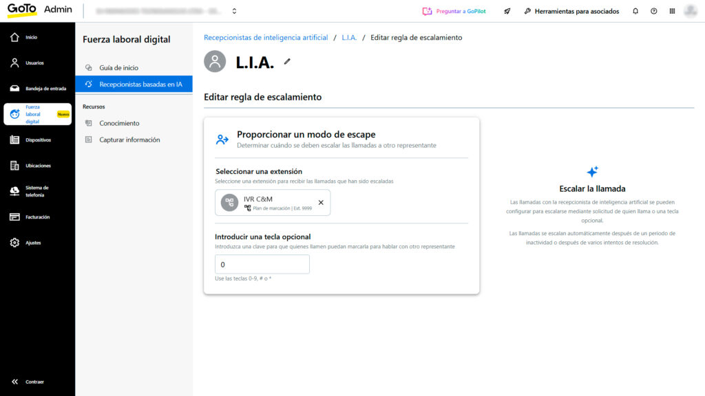 Si la solicitud no puede ser atendida por la IA, o si el flujo lo determina, la llamada se redirige automáticamente a un canal humano, extensión o grupo preconfigurado. El escalamiento puede activarse mediante reglas como “no entendí”, tiempo máximo de espera o al presionar una tecla (0-9, * o #) durante la llamada.