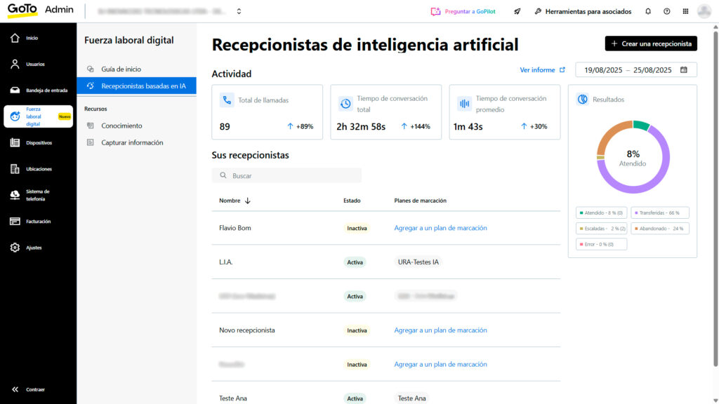 Las métricas en tiempo real muestran el volumen, el tiempo medio de conversación y la tasa de derivación/atención por parte de la IA.
