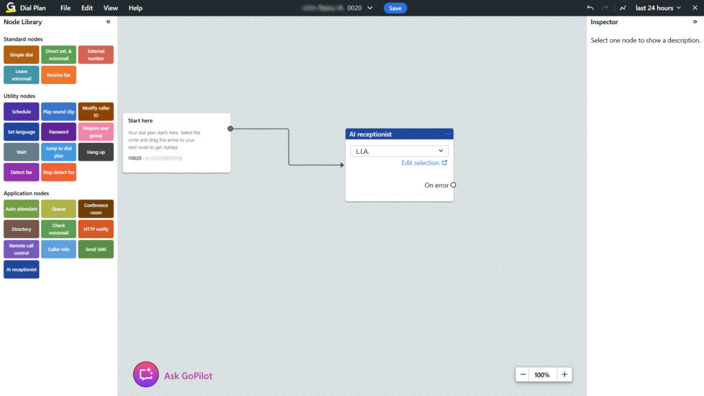 La recepcionista con IA se añade al plan de marcación (flujo) como un nodo dedicado. Tú defines lo que ocurre en caso de error (por ejemplo, una ruta alternativa) y continúas construyendo el flujo de manera visual.